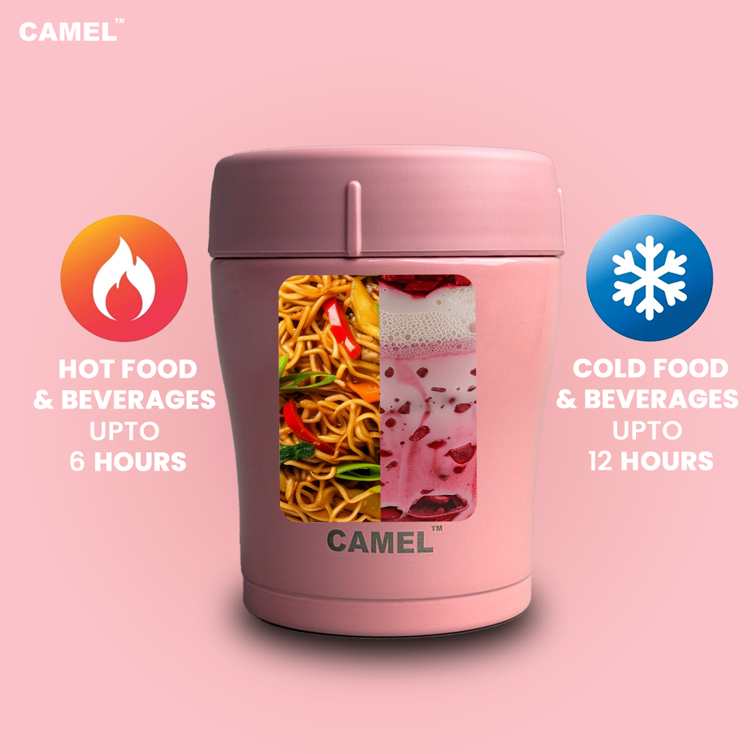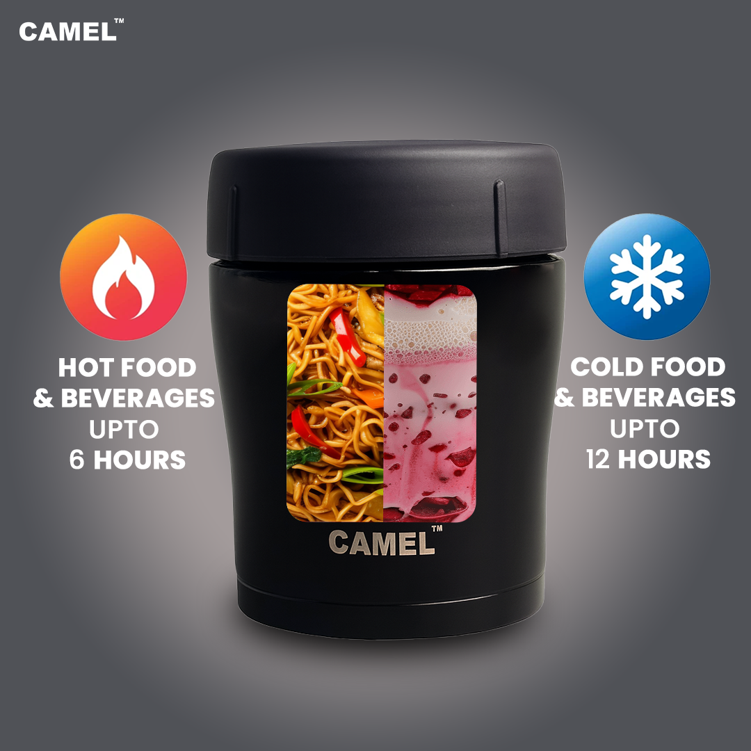 The Camel Trendy Vacuum Food Jar keeps your meals hot for 6 hours or cold for 12, with double-vacuum insulation.